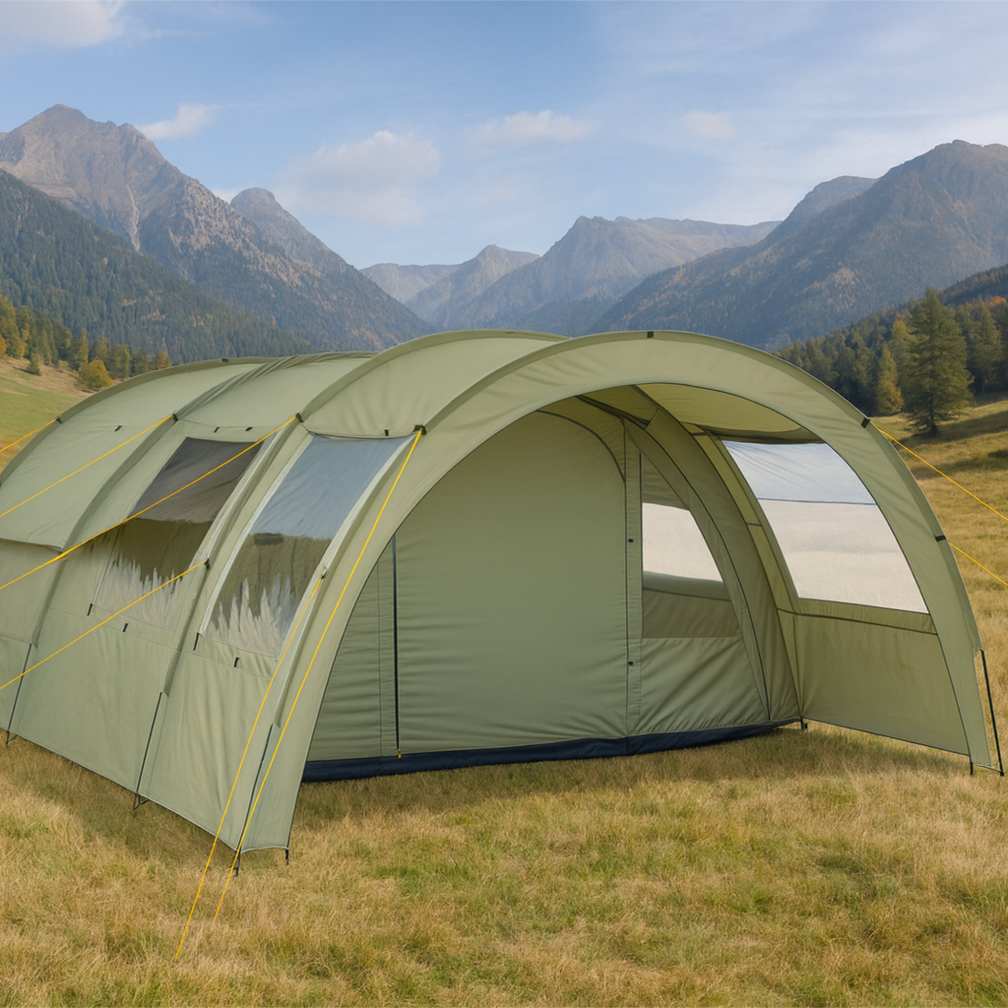 Das großzügige Tunnelzelt wird in einer stabilen Tragetasche geliefert, die den Transport und die Aufbewahrung deutlich erleichtert. So lässt sich das Zelt geordnet verstauen und problemlos im Auto oder Campingmobil mitnehmen.