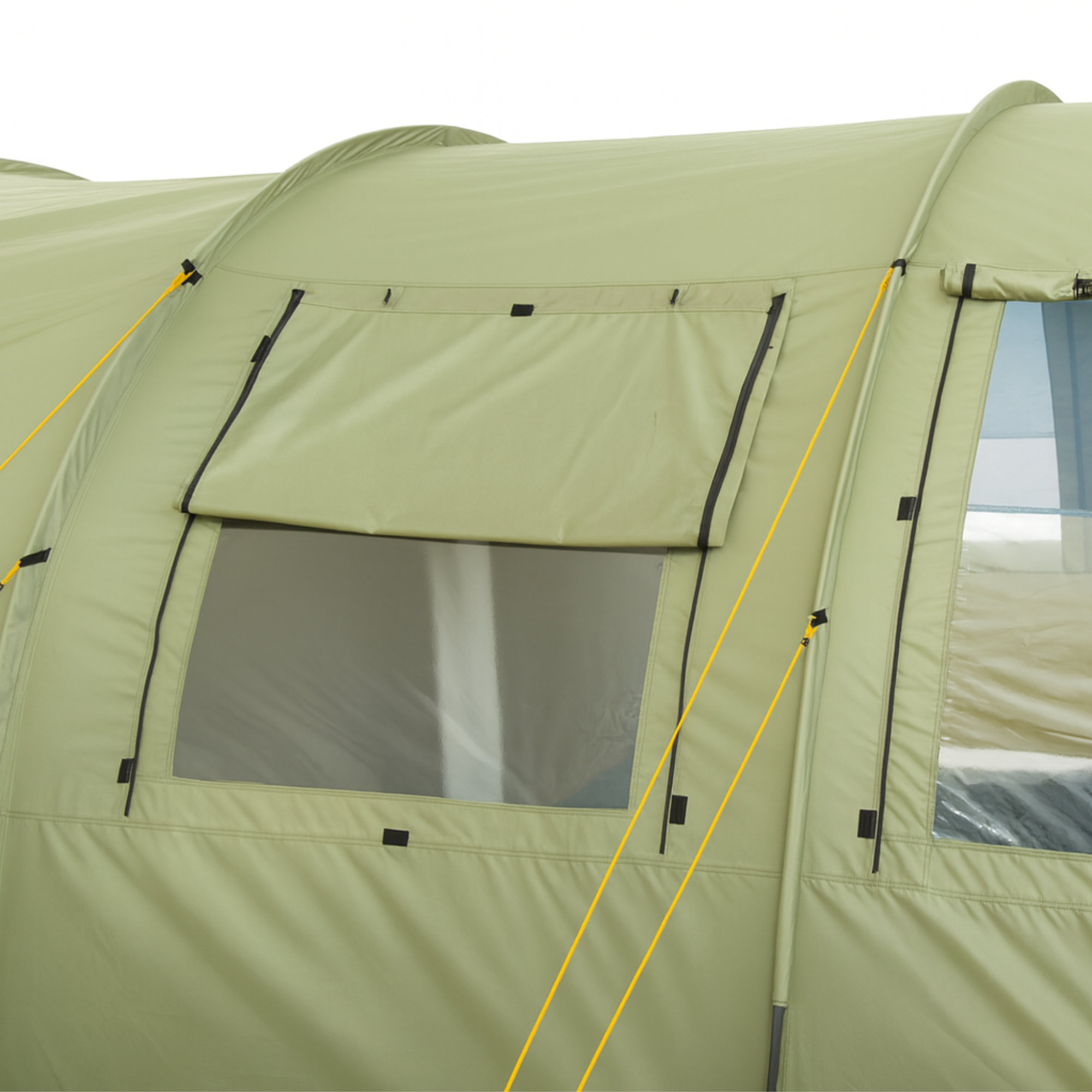 Mit seitlicher Kabel- und Schlauchöffnung per Reißverschluss können Sie Strom ins Zelt leiten oder Ihre Campingküche anschließen. Ein cleveres Detail, das für mehr Komfort und Flexibilität beim Campen sorgt. Zudem bietet der Vorraum bei Bedarf Platz, um bis zu 4 weitere Personen unterzubringen.