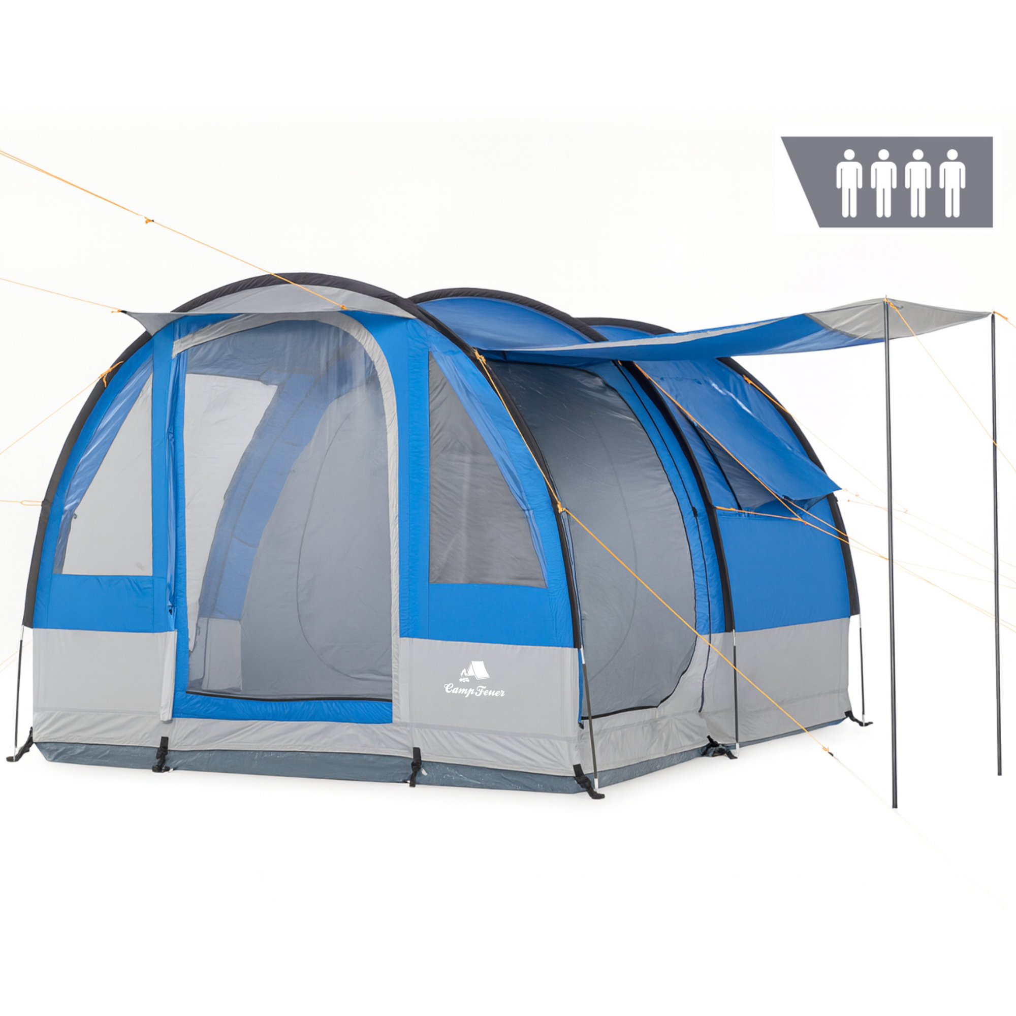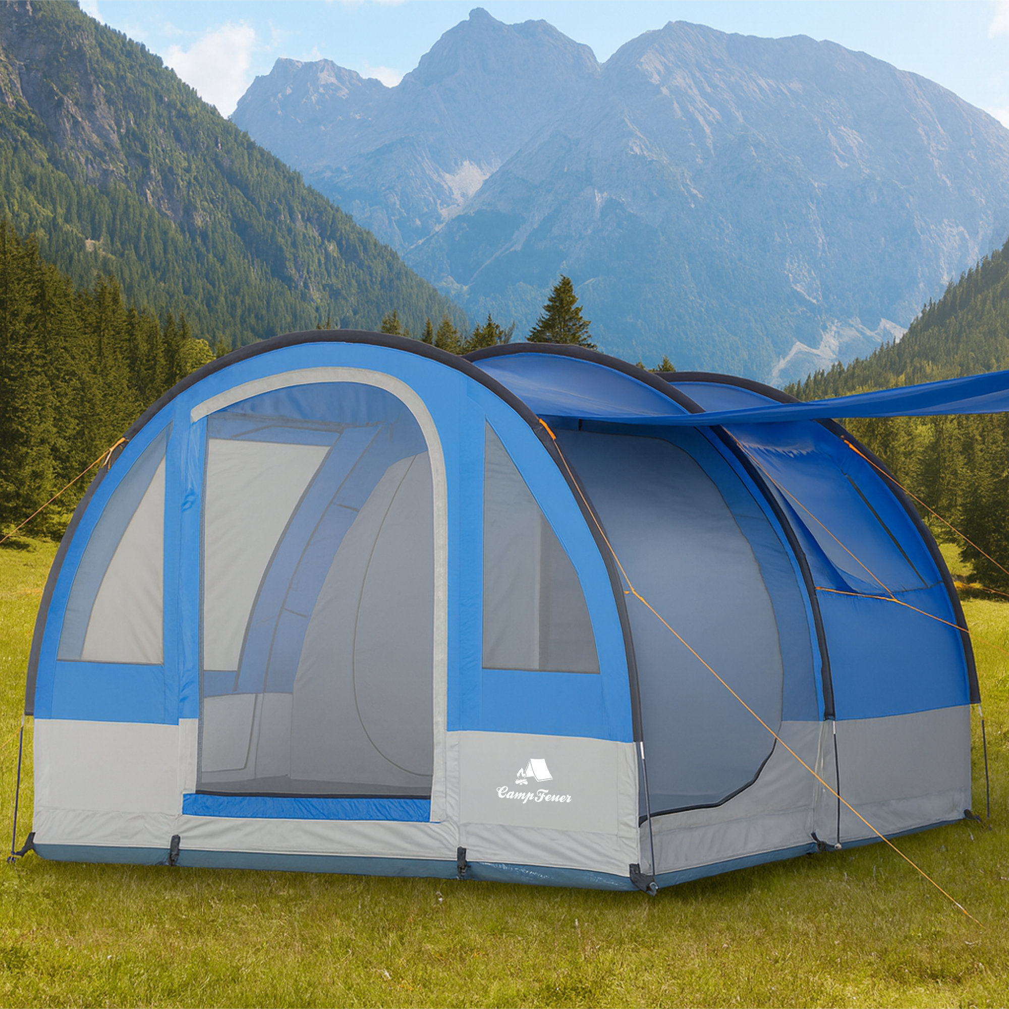 CampFeuer Zelt Smart für 4 Personen 2000 mm Wassersäule, Blau/Grau, Großes Tunnelzelt mit 3 Eingängen