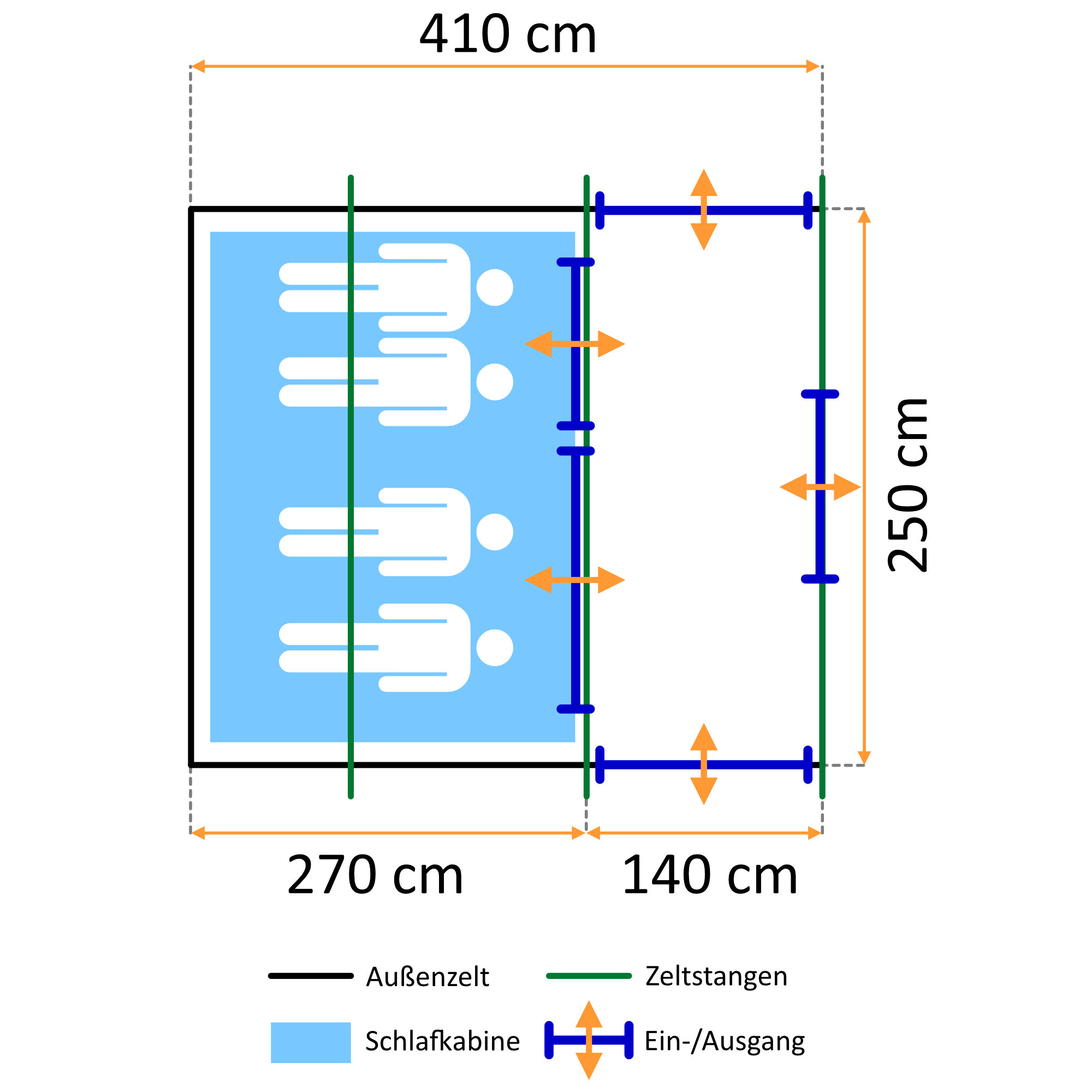 - Aufteilung: 1 Vorraum, 2 abgetrennte Schlafkabinen (wahlweise auch eine große Schlafkabine dank herausnehmbarer Trennwand), Eingang in 3 Positionen aufstellbar