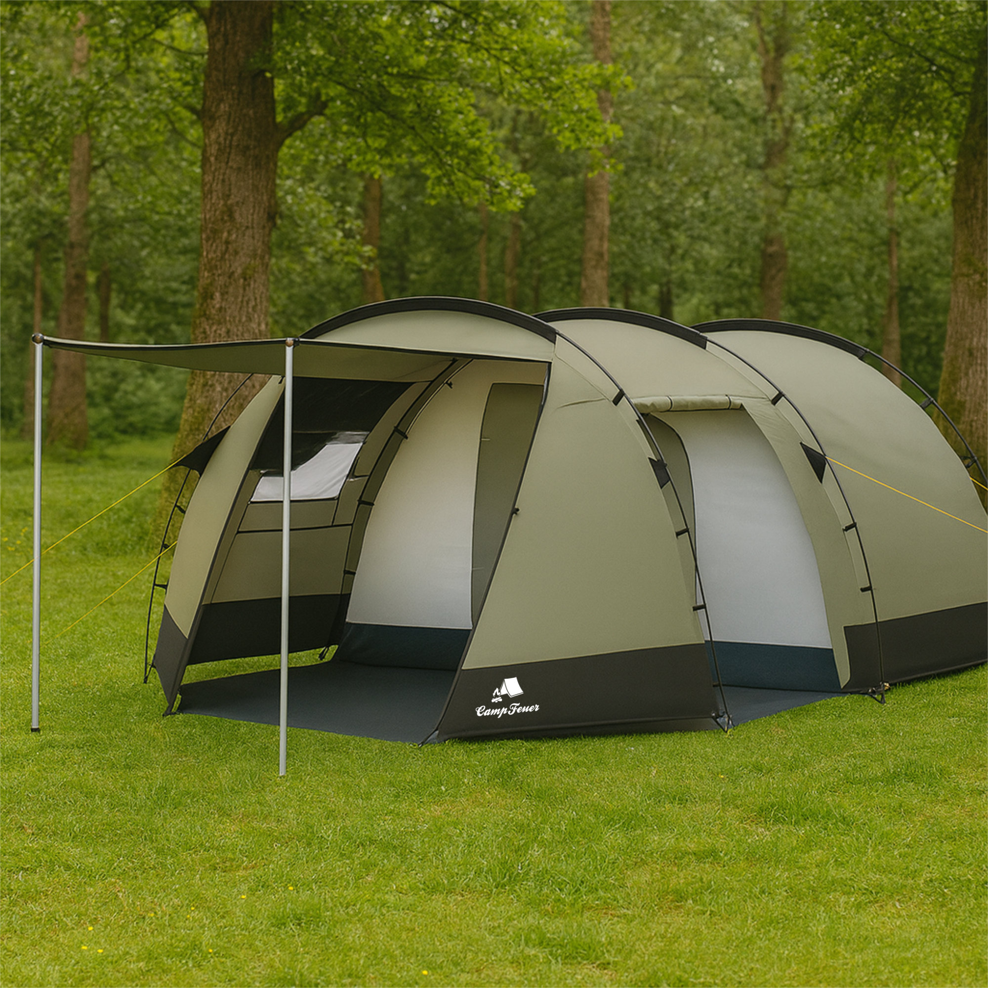 CampFeuer Zelt Super+ für 4 Personen, Olivgrün / Schwarz, XXL Tunnelzelt mit 2 Eingängen und Vordach