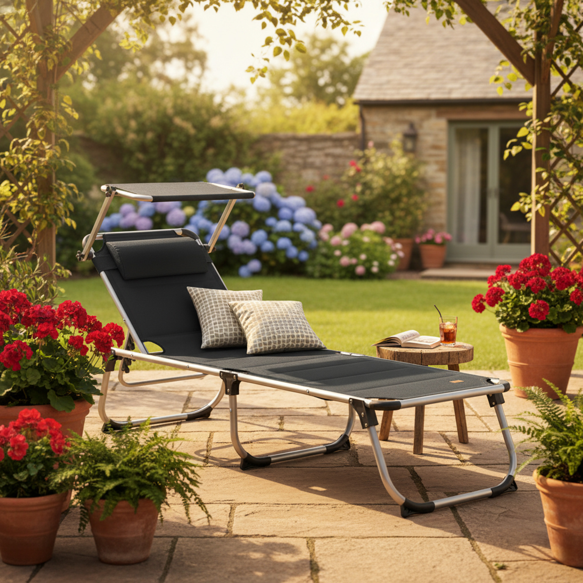 Das strapazierfähige und zuverlässige Sonnendach ist dank seiner stufenlosen Verstellbarkeit perfekt anpassbar. Es bietet Ihrem Kopf Schutz vor direkter Sonneneinstrahlung und lässt sich bei Bedarf mühelos entfernen. Auf diese Weise entscheiden Sie, ob Sie das warme Sonnenlicht auf Ihrem Gesicht spüren möchten. Zusätzlich befindet sich am Kopfteil ein Kissen, das optimalen Komfort bietet.